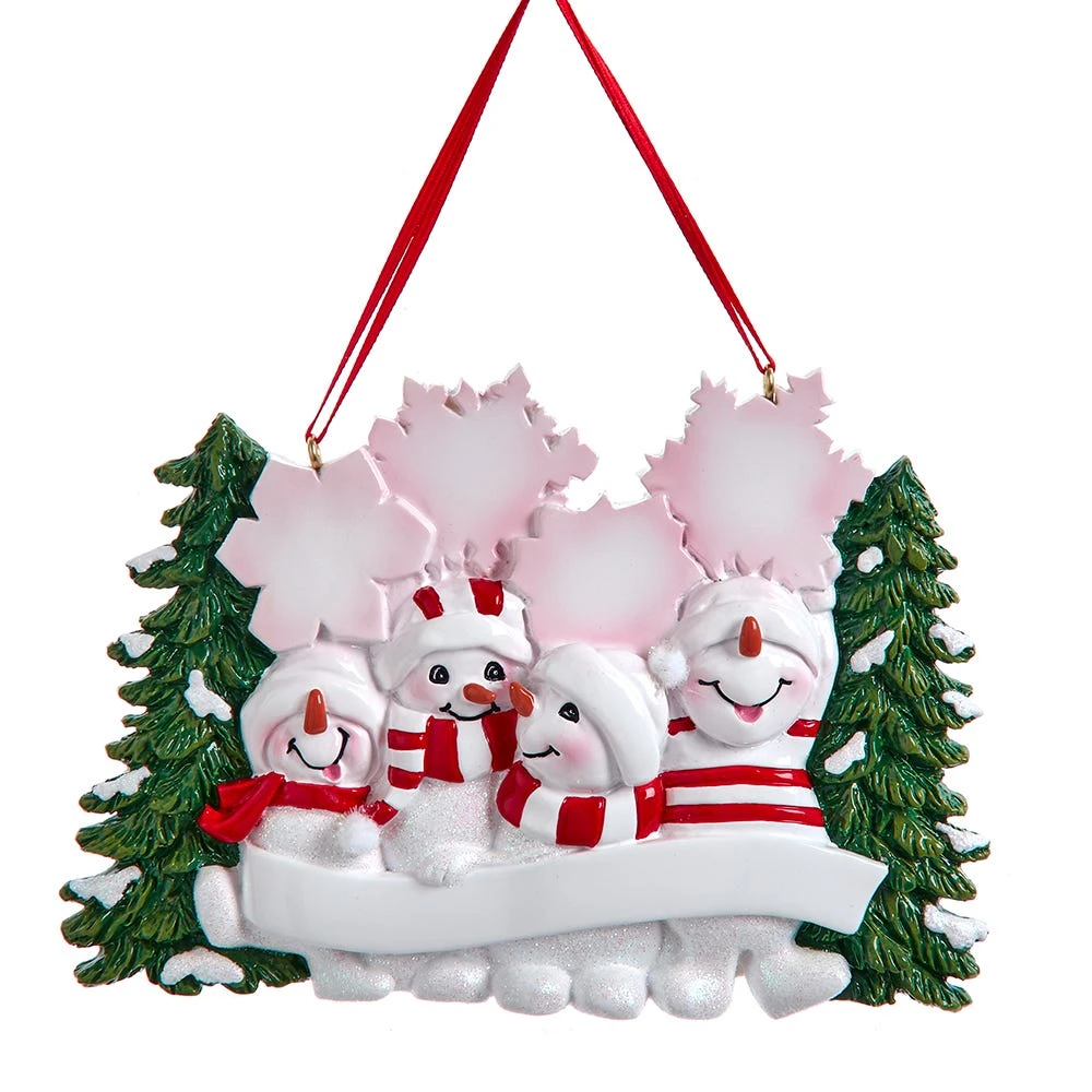 Snowman Family Of 4 With Snowy Christmas Tree & Snowflakes Ornament For Personalization